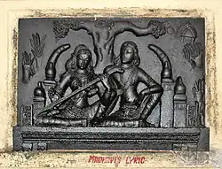 Madhavi was the daughter of a dancer, Chitrapahti.[4] Madhavi was rigorously trained in music, dance and composition of poems. Kovalan, the son of a wealthy merchant and the husband of Kannagi, met Madhavi in a performance in Chola king Karikalan's court.[5][6] Enamoured of her beauty, he fell in love with her. Eventually, Kovalan left his wife and moved in with Madhavi, with whom he stayed for a year. Madhavi bore him a daughter Manimekalai.[7][8] However, after spending all his money on Madhavi, he realised his mistakes and returned to his wife Kannagi.[9]