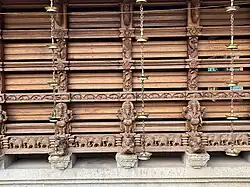 Intricate wood carvings at Madhur temple featuring Ganapathi in different poses