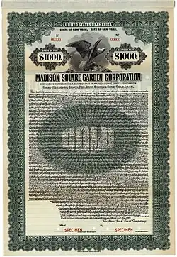 Gold loan specimen of the Madison Square Corp., issued 1. May 1925