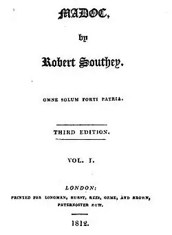 Madoc is an 1805 epic poem composed by Robert Southey. It is based on the legend of Madoc, a supposed Welsh prince who fled internecine conflict and sailed to America in the 12th century. The origins of the poem can be traced to Southey's schoolboy days when he completed a prose version of Madoc's story. By the time Southey was in his twenties, he began to devote himself to working on the poem in hopes that he could sell it to raise money to fulfill his ambitions to start a new life in America, where he hoped to found Utopian commune or "Pantisocracy". Southey finally completed the poem as a whole in 1799, at the age of 25. However, he began to devote his efforts into extensively editing the work, and Madoc was not ready for publication until 1805. It was finally published in two volumes by the London publisher Longman with extensive footnotes.