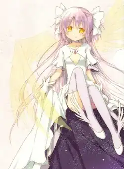 In previous timelines, Madoka became a magical girl in a pink dress wielding a rose branch bow and arrow.[24] In the drama CD, "Memories of You", it is revealed that the wish in the first timeline was to save a cat named Amy from death. However, every time, she was either killed or transformed into a witch named Kriemhild Gretchen, the Witch of Salvation, one that became ever more powerful with each time reset, as Madoka's power also increased and if created would, by the end of that same week, consume all life on Earth in order to create a paradise where there is no free will or individuality to cause strife or conflict. In the first timeline, she still possesses a high amount of power, being able to defeat Walpurgisnacht (ワルプルギスの夜, Warupurugisu no Yoru), though dying in the process.[24] Subsequently, by the current timeline, she has the potential to be the most powerful magical girl to date.[23] Towards the end, she learns of this and Homura's efforts to save her.[23] After seeing the suffering of magical girls throughout history, Madoka decides to make her wish: to prevent all magical girls from the past, present, future and all other timelines, from ever becoming witches. The laws of the universe are rewritten such that at the moment that a soul gem becomes black with anguish, Madoka appears and purifies it before the magical girl passes on. As a result of this wish, she becomes an omnipotent being named Ultimate Madoka (アルティメット・まどか, Arutimetto Madoka), that exists for all time, erasing her pre-ascension existence from the world; leaving only Homura – and to some extent her little brother – with the memory of her. Madoka becomes only a concept in the new world, one named the Law of Cycles (円環の理, Enkan no Kotowari). Magical girls absorbed into the Law of Cycles regain knowledge of their lives in previous timelines.[25]