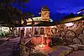 The property is adorned with a pseudo–Swiss Alps exterior and lavish common rooms accented by pink roses, Western murals, and hammered copper. The predominant exterior color is pink, which extends to the lamp posts and trash cans.[3] Each of the 110 guest rooms and suites is uniquely designed and themed, though some tourists stop just to peek at the famous rock waterfall urinal located in the men's restroom,[1][4] a feature designed by Hollywood set designer Harvey Allen Warren.