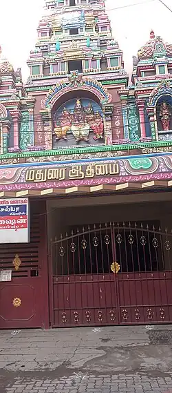 The Mutt is located in South Avani Moola street, close to Meenakshi Amman temple in Madurai. The Adheenam is involved in publishing Saivite literature, specifically Thevaram and Tiruvasakam and its translations. It is also involved in literary scholarship.[4] The Adheenam along with Thiruppanandal Adheenam and Dharmapuram Adheenam were founded during the 16th century to spread the knowledge of Saiva Sidhantam.[5] The Mutt offers Annadhanam (free meals) to devotees in its premises and also the four temples administered by them. The Mutt organizes special worship practices like Nithya and Maheswar Pooja.[6]