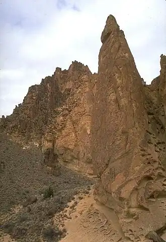 Leslie Gulch lies within the depression of the volcano. Layers of ash and tuff are evident in the formation, and leftover volcanic rocks sit in it as well.[5] The gulch features an array of rock formations and ash erupted from the volcano approximately 15.5 million years ago.[6]