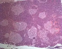 | Photographic image of the numerous islets of various sizes in the pancreas of a patient with Mahvash disease | |