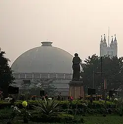 The Birla Planetarium in Kolkata with a statue of Indira Gandhi in the foreground and St. Paul's Cathedral in the background