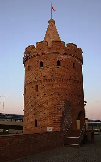 The Maiden Tower (Polish: Baszta Panieńska; German: Frauenturm), also known as the Tower of Seven Coats (Polish: Baszta Siedmiu Płaszczy; German: Siebenmantelturm), is a historic Gothic defensive tower in Szczecin, Poland. It is located at 47 Panieńska Street in the administrative neighbourhood of the Old Town. It was constructed in the 15th century, sometime before 1462, as part of the city fortifications. It was decommissioned in the 18th century, and partially deconstructed at the turn of 20th century. Its base was used to construct a tenement, which was ultimately destroyed in 1944, while the tower was reconstructed and restored between 1961 and 1964.