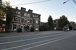 The former Maine Central Railroad General Office Building is located on the west side of the Portland peninsula, below the Western Promenade between Saint John Street to the east and the railroad tracks to the west. It was located adjacent to Portland's Union Station, which was demolished in 1961.[2] The office building is a large E-shaped three story masonry building, presenting the legs of the E toward Saint John Street and its spine to the railroad tracks. Due to the sloping lot, the track side of the building presents four stories. The street-facing front ends of the building are essentially the same, each with round-arched entrances at the center, flanked by projecting round bays that are two stories in height. A modillioned granite belt course separates the second and third floors, with the third floor having eight sash windows grouped 3-2-3. The building is capped by a hip roof, with dormers at the ends of the E legs as well as along the street-facing sides of the connecting sections, which are seven bays in width.[3]