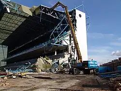 Towards the end of Maine Road's lifespan there were proposals for other sports teams to make use of the stadium following City's relocation; Stockport County once expressed interest in moving there from Edgeley Park,[18][30] and in December 2000 Sale Sharks rugby union club was offered a lease for the stadium.[31] However, none of the proposals came to fruition and some past City players stated their dismay at the stadium not being renovated for a mixed-use sports stadium.[32] Demolition began in late 2003,[33] lasting around 10 months.[34]