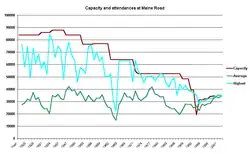 Progressive capacity and attendances for Manchester City matches at Maine Road