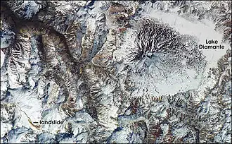 Maipo is located within the Diamante caldera, a feature measuring 15 km by 20 km that is about half a million years old. It rises about 1,900 m (6,230 ft) above the floor of the caldera. Immediately to the east of the peak, on the eastern side of the caldera floor, is Laguna del Diamante, a lake that formed when lava flows blocked drainage channels from the caldera in 1826. The Diamante Caldera erupted 450 cubic kilometers (108 cu mi) of tephra, 450 ka.[4]