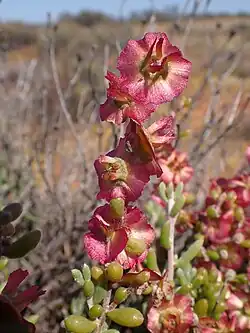 Maireana atkinsiana, commonly known as bronze bluebush,[2] is a species of flowering plant in the family Chenopodiaceae and is endemic to Western Australia. It is a rigid, brittle, dioecious shrub with fleshy, narrowly to broadly egg-shaped leaves with the narrower end towards the base, pairs of male and female flowers, and a pink to red, thin-walled fruiting perianth.