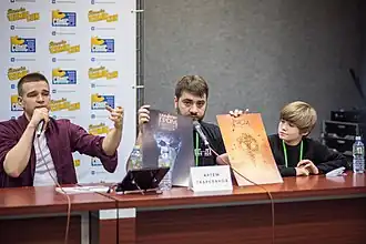 Vladimir Besedin, Artyom Gabrelyanov, and Oleg Chugunov during the film's presentation at IgroMir/Comic-Con 2017