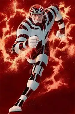Makkari was later rescued by Quasar when he began running rampant, literally.[23] He revealed that he had traded his other Eternal abilities for greater speed and endurance. He became friends with Quasar when he enlisted Quasar to go to Lemuria to help him save Master Elo, who was tutoring Makkari on how to channel his cosmic energy into more speed.[24] He then accompanied Quasar to the Stranger's laboratory world. There, he encountered the Star-Dancer, and battled Trikon and the Whizzer.[25] Makkari later worked in Quasar's office under the alias "Mike Khary." He participated in a marathon to the Moon sponsored by the Runner, one of the Elders of the Universe, and nearly won; he bested Quicksilver, Captain Marvel, Whizzer, Speed Demon, Black Racer, and Super Sabre, only to lose the race in the last moments to an amnesiac, dimension-spanning being.[25] Makkari then became Quasar's roommate.[26] He was killed when his heart was stopped by Maelstrom,[27] but returned to life,[28] as part of an agreement struck between Eternity, Death, Infinity and Oblivion. Maelstrom later attempted to seize more power by draining the kinetic energy from Makkari, but Maelstrom was ultimately defeated by the other Eternals. However, he soon found he had become so fast that he could no longer move in synch with the rest of the universe.[29]