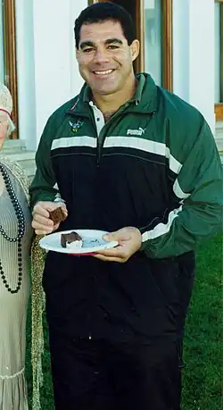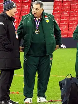 Malcolm Norman Meninga AM (/məˈnɪŋɡə/; born 8 July 1960) is an Australian professional rugby league coach and a former professional rugby league footballer. Meninga is widely regarded as one of the finest players in the game's history. He enjoyed a long career in both Australia and England, playing mainly as a goal-kicking centre. After retiring, Meninga has enjoyed success as a coach, and is currently the head coach of Australian national team.[7]