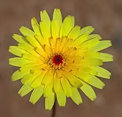 Like other members of its genus, Malacothrix glabrata has a milky sap and daisy-like flower heads. The plants grow to 15 to 40 cm (5 to 15 in) tall. The leaves are 6.5–12.5 cm (2+1⁄2–5 in) long, with stringy lobes.[1] The fragrant flower heads are 2.5 to 6.5 cm (1 to 2+1⁄2 in) wide,[1] composed of smaller yellow to white strap-like flowers called "ligules".[2] In the center of the flower head may be an orange to red "button", composed of several immature flowers.[3]
