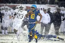 Perry's first 100-rushing yard game came against Cincinnati, followed by 104- and 127-yard performances against Tulsa and Air Force, respectively; the latter was a then-career-best for Perry.[13] The Air Force game also saw him record a 91-yard touchdown, the third-longest carry in Navy history and the longest at Navy–Marine Corps Memorial Stadium,[18][13] along with his first receiving touchdown on a 40-yard completion from Abey.[17][13] In a 31–21 loss to UCF, Perry scored a 75-yard receiving touchdown and had a second score that was nullified by a holding penalty.[19]