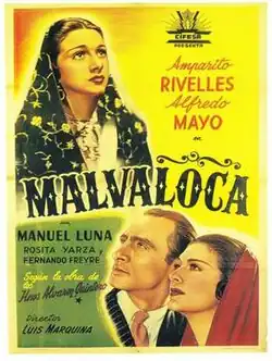 Malvaloca is a 1942 Spanish drama film directed by Luis Marquina and starring Amparo Rivelles, Alfredo Mayo and Manuel Luna. It is an adaptation of the 1912 play of the same title about a fallen woman from Málaga who eventually redeems herself.[1] Following the film's success Rivelles was signed up for a lucrative three-year contract by CIFESA, the biggest studio in Spain.[2]