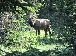 The elk, or wapiti (Cervus canadensis), is one of the largest species of deer in the world and one of the largest mammals in North America and eastern Asia. In the deer family (Cervidae), only the moose, Alces alces (called an "elk" in Europe), is larger, and Cervus unicolor (the sambar deer) can rival the C. canadensis elk in size. Elk range in forest and forest-edge habitat, feeding on grasses, plants, leaves, and bark.