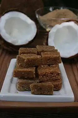 Mampostial, also referred to as Marrallo, is a shredded coconut, toasted sesame seed, molasses, cinnamon, sweetened with either honey or brown cane sugar candy in Puerto Rican cuisine cooked over medium heat and prepared into a dessert. It can also have additional vanilla, nuts, or fruit such as pineapple, orange, mango, or guava. Mampostial can also be used as a empanada or pie filling and baked.[1][2][3]