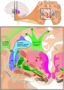 Circuits of the basal ganglia in treatment of Parkinson's disease – model of the effect of medication on motor symptoms: levodopa, dopamine agonists and MAO-B inhibitors stimulate excitatory signals from the thalamus to the cerebral cortex by effects on the striatum, compensating for decreased dopaminergic signals from substantia nigra (seen at bottom right).