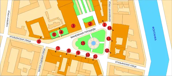 The shape of Manezhnaya Square is close to the right-angled triangle. Its longest cathetus, the southern side of Manezhnaya Square is formed with Italyanskaya Street, which runs parallel to Nevsky Prospect, at about hundred meters north of it. The shortest cathetus is Karavannaya Street, which forms the eastern side of the square running from Nevky prospect to the north. Another street connecting the square to Nevsky is Malaya Sadovaya which intersects Italyanskaya Street at the western corner of the square. Here converges the third, longest side — the "hypotenuse" of this triangle square. Driveways flanking one of the buildings on this side of the square merge behind it into a boulevard, Klenovaya alley, which runs from Manezhnaya Square to Mikhailovsky Castle.[3]
