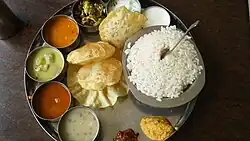 Mangalorean Catholic cuisine has distinct Portuguese influence due to the history of colonialism as can be seen in Laitao, the famous pork roast served as the Pièce de résistance at wedding dinners, and Pork Sorpotel. Mangalorean Catholics mix pork blood and other parts in most of their pork delicacies as can be seen from Pork Bafat, Cabidela and Kalleze un Kiti (heart and intestines). Sanna-Dukra Maas (Sanna – idli fluffed with toddy or yeast; Dukra Maas – Pork)[2] and Unde-Dukra Maas (Unde – leavened bread; Dukra Maas – Pork) are popular dishes. Bokrea Maas (mutton) and Kunkda Maas (chicken) with dishes such as Chicken Indaz are popular. The traditional Rosachi kadi (Ros Curry), a fish curry made with ros (coconut milk) is quite popular and is served during the Ros (anointing) ceremony that is held one or two days before a Mangalorean Catholic wedding. Their fish curry, especially their Fish Roe Curry, is known for its taste in the whole of coastal India while fried fish in their style is well known. The Sheveo Roce and Pathal Bakri (a variant of Kori Rotti) are dry rice flakes dipped in chicken gravy dishes.[1]