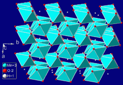 Manganite is a mineral composed of manganese oxide-hydroxide, MnO(OH), crystallizing in the monoclinic system (pseudo-orthorhombic).[3] Crystals of manganite are prismatic and deeply striated parallel to their length; they are often grouped together in bundles. The color is dark steel-grey to iron-black, and the luster brilliant and submetallic. The streak is dark reddish brown. The hardness is 4, and the specific gravity is 4.3. There is a perfect cleavage parallel to the brachypinacoid, and less-perfect cleavage parallel to the prism faces. Twinned crystals are not infrequent.