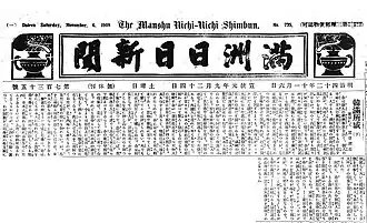 The Manshū Nichi-Nichi Shimbun (満洲日日新聞; lit. 'Manchuria Daily News') was a Japanese-language newspaper owned by the South Manchuria Railway Company and printed from 3 November 1907 until Japan's defeat in the Second World War in 1945. Printed in Dairen (now Dalian), capital of the Japanese-controlled Kwantung Leased Territory, and from 1938 in Mukden (now Shenyang), it was the most influential newspaper serving the growing Japanese settler population in northeastern China.[1][2] In 1927, it merged with the rival Ryōtō Shimpō (遼東新報; lit. 'Liaodong News') and was renamed the Manshū Nippō (満洲日報; lit. 'Manchuria Daily Report'), before returning to its original name in 1935 following another merger with Dairen Shimbun (大連新聞; lit. 'Dairen News'), whereupon it gained a complete monopoly on Japanese-language news in what had become the Japanese puppet state of Manchukuo.[1][3] In 1944, it briefly changed its name back to Manshū Nippō before going out of print in 1945 following Japan's defeat in the war and subsequent withdrawal from Manchuria.[2]