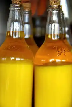 Manteiga de garrafa is a dairy product made from the cream of cows' milk.[1] The cream is processed by physical agitation, as in a blender or beating by hand, followed by cooking at a temperature of 100 °C (212 °F) to 130 °C (266 °F). Salt may also be added.[1] Some recipes for making manteiga de garrafa include a step prior to cooking in which the congealed cream is washed in cold water.[2] The cooking process separates the cream into two components, the manteiga (butter) and the "borra" (a watery precipitate). The manteiga is separated from the borra by filtration, and then placed in bottles. The finished product is almost pure fat, with a low water activity. Accordingly, it is inhospitable to microbial growth and can be kept at room temperature.[1][3]