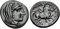 Veiled head of Manto (left) and a Thessalian horse rider inscribed on a 3rd-2nd century coin (right)