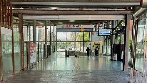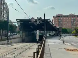 Marítim is a metro station of the Metrovalencia network in Valencia, Spain, and is the terminus of Lines 5, 6, 7, and 8. It was opened on April 3, 2007, as an extension of Line 5 to connect with the existing surface tram lines to the east. This occurs via an underground cross-platform transfer on one of two island platforms. The southernmost platform is not in revenue use and does not have cross-platform fare gates. The station is located in a wide median space of Carrer Jeroni de Montsoriu. At the east end of the station, the tram tracks ramp up to street level and follow Carrer de Francesc Cubells.