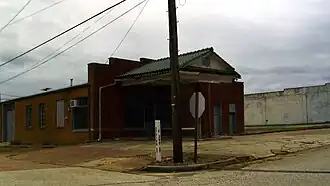 The Marathon Oil Service Station is a historic automotive service facility at the southeast corner of East 2nd and Spring Streets in downtown Fordyce, Arkansas. It is a single story building constructed out of red and buff brick, with an auto canopy covered in a tile roof. The main facade of the building has a parapet which conceals a barrel roof. The building is divided into two functional bays, an office to the left and a garage bay to the right. The canopy extends in front of the left bay, and is supported by a single brick column, in which there is an original Marathon Oil logo. The building is a well-preserved example of a 1920s service station.[2]