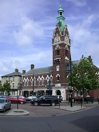 The new building was designed by W. T. Unwin in the Renaissance style, built in red brick with stone dressings at a cost of £3,000 and was completed in 1900.[1][4] It was originally described as a "Corn Exchange, offices etc".[5] The design involved an asymmetrical main frontage with eight bays facing onto the Market Square.[1] A 110 feet (34 m) high tower was erected in the bay to the right of the centre: it featured an arched doorway with a paired-pilaster surround in the first stage, a narrow round-headed window in the second stage, a French door and a balcony in the third stage, a clock in the fourth stage and, above that, there was a spire surmounted by a bell turret and a statue of Britannia.[1] The left-hand section of four bays originally featured small sash windows on the ground floor and paired ogee-headed windows on the first floor, while the right-hand section of three bays featured small sash windows on the ground floor and single ogee-headed windows on the first floor.[1] The clock, which was designed and manufactured by Sainsbury Brothers, was paid for by public subscription and installed to celebrate the Diamond Jubilee of Queen Victoria.[6] The bells were recovered from the old market hall.[7] Internally, the corn exchange was on the ground floor and the municipal offices were on the first floor.[2] The ground floor was also converted to municipal use in 1912.[6]