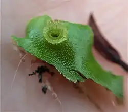Marchantia berteroana is a flat, thalloid liverwort, with thallus up to 2 cm (0.79 in) long and 1.2 cm (0.47 in) wide. The thallus colour can range from dark green to yellow with a glossy surface, and is attached to the ground via rhizoids. Under a lens, pores can be seen on the upper surface. The gametangia (sex organs) grow vertically from the thallus, the plant is dioicous so individual plants produce male or female gametangia.[1] The male gametangia are called an antheridiophores, they are short with a flat disc-like structure which is approximately 1 cm (0.39 in) wide. The female gametangia are called archegoniophores, they have a taller stem and an umbrella-like structure at the top, approximately 1 cm (0.39 in) wide, from which the common name is derived. They also reproduce asexually via gemma cups which form on the surface of the thallus, they are approx. 4 mm (0.16 in) wide and 3 mm (0.12 in) high.[2] Gemma cups appear on the thallus more commonly in winter[3] when rainfall is higher, as raindrops are required to disperse the gemmules.