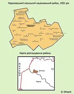 Marchlewszczyzna (Ukrainian: Мархлевский польский национальный район) was a Polish National District in the Ukrainian Soviet Socialist Republic created as an experiment[1] and as part of the Soviet korenizatsia campaign in Zhytomyr Okruha to the west of Zhytomyr[2] on 21 July 1925 by resolution of the Little Presidium of the All-Ukrainian Central Executive Committee. Its capital, the town of Dovbysh, was renamed later in 1926 as Marchlewsk.[1][3] The district was one of 32 other national districts that were created in the Ukrainian SSR during that period (1924-1939).[2] Creation of the district was based on standards adopted by the fourth session of the All-Ukrainian Central Executive Committee (15-19 February 1925) and recommendations of the Central Commission in affairs of National Minorities at that executive committee.[2] It was created to implement an idea in creation of Polish national districts on territories of Ukrainian and Belarusian SSRs.[2]