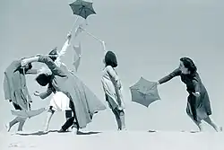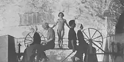 While some works were or included duets,[41][42] most of Barr's choreography involved groups.[1][36] Sometimes two or more groups were performing different activities in different parts of the set.[43] Barr's stage sets and props were minimal,[44][45] and included platforms,[36] benches,[46][47] chairs,[38][48] and ladders,[35] all creating height; plastic representing snow[36] or green cloth representing water;[46] ropes,[36][49] gymnastic hoops[33][50] and other tubular shapes;[51] metal rods and wires,[49] and frames made of metal, wood or other materials to represent buildings or mountains.[48][36][52]
