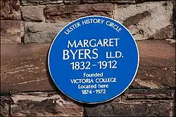 Margaret Byers (née, Morrow; April 1832 – 21 February 1912) was an Irish educator, activist, social reformer, missionary, and writer of the long nineteenth century. She was the founder of Victoria College, Belfast. Byers was involved in philanthropic work, with especial reference to the training of the young. She wrote many papers on different phases of the progress of girls' education in Ireland, on Irish industrial schools, and on temperance.[1]