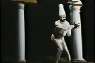 Send/Receive (1977, with Liza Béar, Richard Lowenberg, Willoughby Sharp and Keith Sonnier) demonstrated Fisher's embrace of technology; it used a NASA CTS satellite—the first artist-initiated project to do so—to facilitate a performance in which Fisher (in San Francisco) and Nancy Lewis (in New York) responded to one another's movements in real time.[48][49][50] Fisher's solo suite, Splitting (1977–82), featured an evolving, increasingly complex movement language[1][51][41] that combined immediacy[29] and improvisation,[37] with "moments of bizarre, dadaist lunacy" (involving plucked chickens and a harmonica, among other elements);[52][53] critic Robert Palmer described it as a fascinating, non-linear work whose flow and rhythmic drive suggested contemporary jazz.[42] The dream-like, minimal performances Gli Insetti and Il Miglior Fabbro (1978–89) referenced the works of entomologist Jean Henri Fabre and offered divergent takes on the scientist's relationship to his object of study.[18][44] They featured Hughes as "Arturo Scienziato" and Fisher as a woman/insect traversing her life-cycle through movements reviewers termed alternately grotesque, hilarious, and rapacious; composer Robert Ashley called Fisher's choreography, "the most authoritative demonstration of the mechanics of insect movement."[54][55][13]