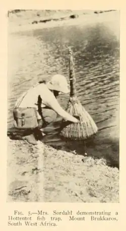 Sordahl also collected another new species of robin, Erythropygia coryphaeus abboti, which was named after Charles G. Abbot, who was Director of the Smithsonian.[3][6][8] Twenty-seven species were collected by her - ten were new to the Smithsonian's collection and two were new to science. Other birds collected, included a starling, a shrike that "whistles like boys", a bulbul and other desert-dwelling species.[9] Margaret's brother also accompanied the couple to Namibia.[5]