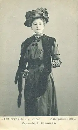 Among the parts she was the first performer of in MAT were Antigona in the Sophocles' tragedy, Magda in The Sunken Bell by Gerhart Hauptmann, Tsaritsa Maria in The Death of Ivan the Terrible by Alexey K. Tolstoy, Anna in The Lower Depths by Maxim Gorky, The Spring in Alexander Ostrovsky's Snow Maiden. Her performance as Olga in Chekhov's Three Sisters has been described (by theatre historian Inna Solovyova) as "outstanding" and earned praise from Maria Ermolova who became her close friend in late 1900s. Savitskaya, who died in 1911, has been described as "the symbol of the original MAT's ethics". She was interred in the Novodevichy Cemetery, next to the Chekhov monument.[1]