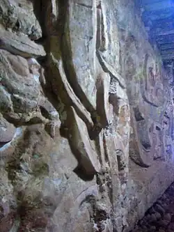 Two mirrors made of polished pyrite were found in the burial chamber as well. While mostly eroded, the faint painted design on the back indicated that the back was elaborately painted. There were small yellow dots and stars with other colored fine-line designs. Although difficult to see the archaeologist determined that these were the same designs that they found on the "Dazzler" that they found in the upper chamber in a Teotihuacan design.[3] This design was also found in the neighboring Hunal tomb. One mirror was less eroded and depicted a figure in profile with speech scroll, an object of some sort in his hand and the rim was decorated with a serpent which was important in Maya culture. These mirrors were most likely worn with cords as necklaces.[3]