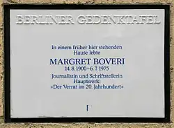 Margret Antonie Boveri (Würzburg, 14 August 1900 – Berlin, 6 July 1975)[1] was one of the best-known German journalists and writers of the post-World War II period. She was a recipient of the German Critics' Prize and the Bundesverdienstkreuz.