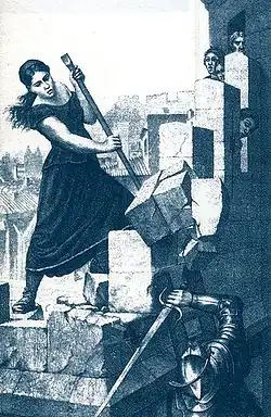 During the French Wars of Religion, Marguerite Catherine Ponsoye Delaye, also known as Margot Delaye or La Gandonne, was a woman who fought during the siege of Montelimar by Admiral Coligny in April 1570, during which she lost an arm. This battle was part of the French Wars of Religion. A one-armed statue was erected in her honor.[1]