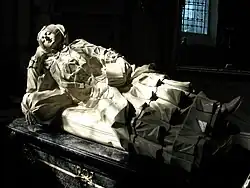 In 1773, Jerzy Mniszech erected a Rococo tomb by Jan Obrocki of Lwów in the chapel of the Dukla parish church of St. Mary Magdalene. The chapel is designed as a Rococo boudoir, her sarcophagus is carved from black and white marble and depicts the deceased in court dress, her head resting on one hand and a book in the other, as if she were dozing. Her epitaph was written by Rafał Modlibowski. In Warsaw, in the church of St. Antoni Padewski on Senatorska Street also has the epitaph for the two wives of court marshal Jerzy Mniszech, including "Maria Amalia née von Brühl".[2] There's also a plaque commemorating Maria Amalia Mniszech in the Franciscan church in Sanok, as well as the Franciscan church in Biecz, St. John the Baptist Church in Kobylanka, and the St. Catherine of Alexandria Church in Jaśliska.