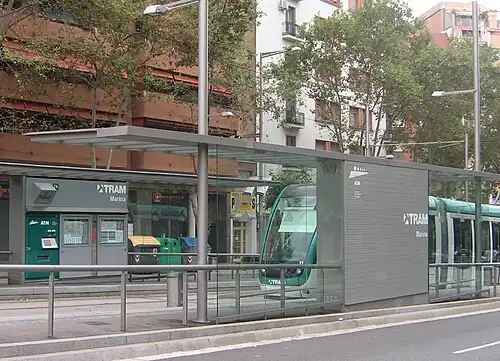 Marina is a station in the Barcelona Metro and Trambesòs tram networks, at the boundary between the Eixample and Sant Martí districts of Barcelona. It is served by TMB line L1 and tram route T4. The station is named after the nearby Carrer de la Marina, and can be accessed from Carrer dels Almogàvers, and the crossing of Carrer de la Marina with the Avinguda Meridiana. It is adapted for disabled people.[1][2][3][4]