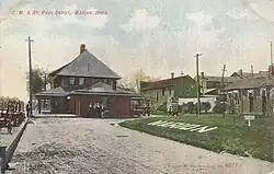 In 1888, a two-story brick station was built by the Milwaukee Road for $30,000. This station was the third station in Marion, replacing stations built in 1873 and 1878.[3]: 22  The town was then established as a division point of the Iowa District First Division, relocated from Van Horne, 27 miles (43 km) west of Marion.[4][5] With the division point moving to Marion, maintenance shops and a roundhouse were also built on the eastern edge of town.[6] The development of the railroad was considered vital to the growth of Marion, and the Milwaukee Road was the largest employer in Marion at one point.[3]: 24  A streetcar station was also established across the street from the Milwaukee Road station, and has since been demolished.[7]: 32
