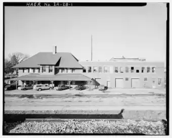 The 1888 station was built of brick, and contained multiple waiting rooms on the first floor: one for men and one for women. The first floor was finished with wood, and also contained space for a ticket's office and baggage/mail area. The second floor was used for offices of the railroad superintendent and train dispatcher. It contained a bay window so both directions of the tracks could be viewed.[12][6] The railroad tracks were located on the north side of 6th Avenue, in a street running configuration.[7]: 31–32  The right-of-way is now used as a rail trail known as the Grant Wood Trail.[13]