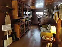Visitors may enter the installation to examine the artifacts at close range, and to relax on the retro-replica sofa while reading. The furnishings were custom-built to the artist's specifications, and reflect the Mid-century modern style of the time.[29] A small passport-sized 40-page booklet narrates the history of the Rose Art Museum, and the sourcing of some of the artifacts on view. A set of three blue insert sheets catalogs many of the artworks and other items on display; copies of the booklet can be purchased for $5 from an attendant at the entry to the museum.[31][32]