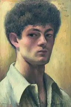 From an early age, Gertler showed signs of a great talent for drawing. On leaving school in 1906, he enrolled in art classes at Regent Street Polytechnic. Due to his family's poverty, he was forced to drop out after a year, and in December 1907, he began working as an apprentice at Clayton & Bell, a stained glass company.[8] He disliked his work there and rarely spoke of it in later years.[8] While there, he attended evening classes at the Polytechnic. In 1908, Gertler was placed third in a national art competition and it inspired him to apply for a scholarship from the Jewish Education Aid Society (JEAS)[A] to resume his studies as an artist.[9] The application was successful. Upon the advice of the prominent Jewish artist William Rothenstein, he enrolled at the Slade School of Art in London in 1908. During the four years he spent at the Slade, Gertler was a contemporary of Paul Nash, Edward Wadsworth, C. R. W. Nevinson, Sir Stanley Spencer, Isaac Rosenberg, and Morris Goldstein, among others.